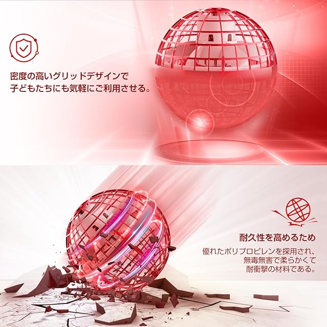 【優れた材料と独特なデザインの両立】耐久性を高めるため優れたポリプロピレンを採用され、無毒無害で柔らかくて耐衝撃材料である。軽く柔軟性のある作りなので落ちても壊れない。コントローラーを使用せず、赤外線で四方を感知して自動で飛んでくれるフライングボールであり、手を近づけたり、壁に近づいたら反対方向へ飛んでくれるので簡単に飛ばせて遊べる。中央のLEDが色を変えて点滅し綺麗で、夜に遊びるとアステロイドのような輝いているフライングボールは手中で回転する。
