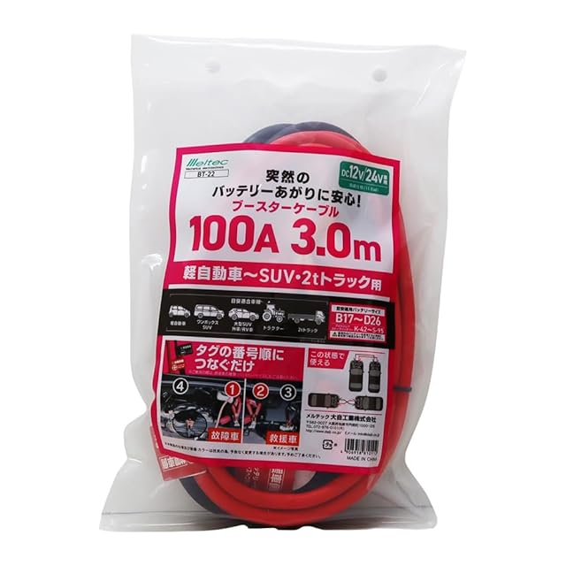 商品名:メルテック(meltec) ブースターケーブル 軽自動車~2tトラック用 DC12V/24V・100A 3m BT-22 レッド/ブラック