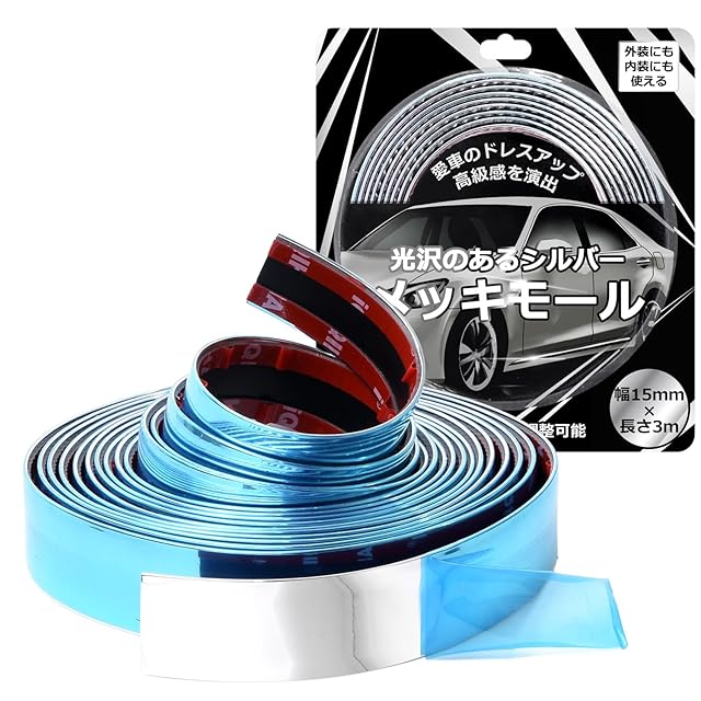 商品名:メッキテープ メッキモール マルチモール 【シルバー/幅:6mm~30mm/長さ:3m、5mから選択可能♪】 モール メッキ 車用 アクセント メッキ モール 「メタリックでスタイリッシュに愛車をドレスアップ♪」 テープ ドレスアップ 汎用 カー用品 【NMJ】 (15mm×3m)