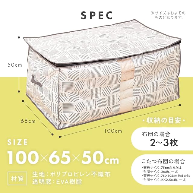 【商品仕様】商品サイズ/(約)100×65×50cm、収納目安/布団:2~3枚・こたつ布団:天板サイズ約75cm角または布団サイズ約2m角一式・天板サイズ約75cm×105cmまたは布団サイズ約2×2.5m一式、材質/生地:ポリプロピレン不織布・透明窓:EVA樹脂