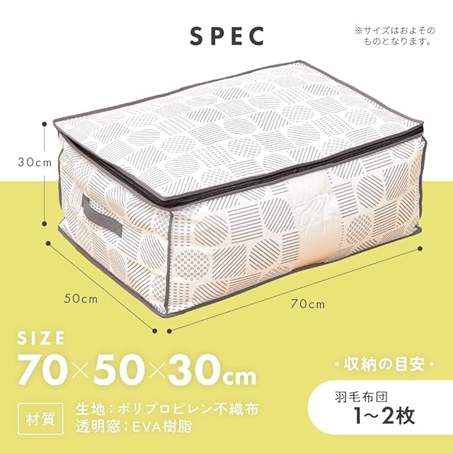 【商品仕様】商品サイズ/(約)70×50×30cm、収納目安/羽毛布団1~2枚、材質/生地:ポリプロピレン不織布・透明窓:EVA樹脂