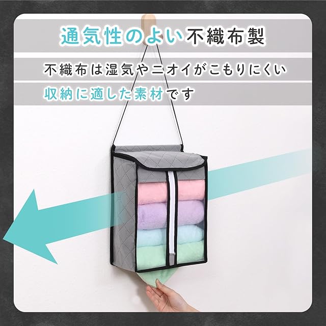 【吊り下げタオルストッカー】:フェイスタオルを下から1枚ずつ取り出せる、通気性の良い不織布製のタオル収納ケース。