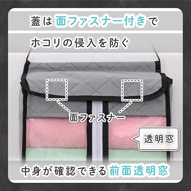 アストロ 活性炭消臭 タオル収納ケース グレー 【タオルストッカー 壁掛け 吊り下げ】 通気性の良い不織布製 活性炭の力でタオルを消臭保管 タオルホルダー フェイスタオル 保管ケース ランドリー収納 洗面所 洗面台 タオル入れ 透明窓付き 171-92