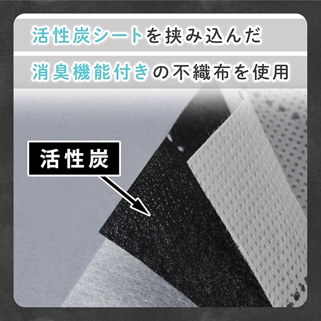 【活性炭のチカラで消臭保管】:活性炭が空気中のにおいの元となる物質を吸着し、タオルを消臭しながら保管できる。