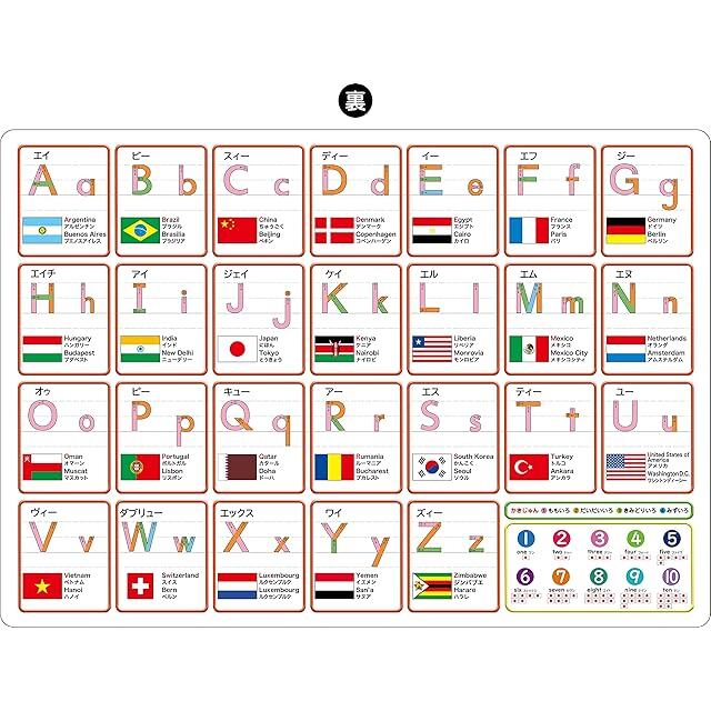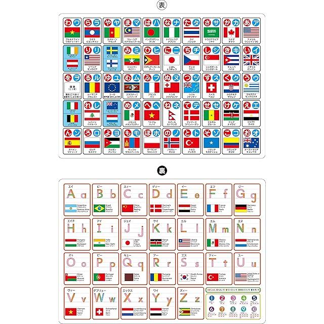 表では、国旗から国名と首都を覚えながら楽しくひらがな・カタカナ50音も学習できます。通常の「アイウエオ」ポスターよりもレベルは高いですが、学習意欲の高いお子様にオススメです。