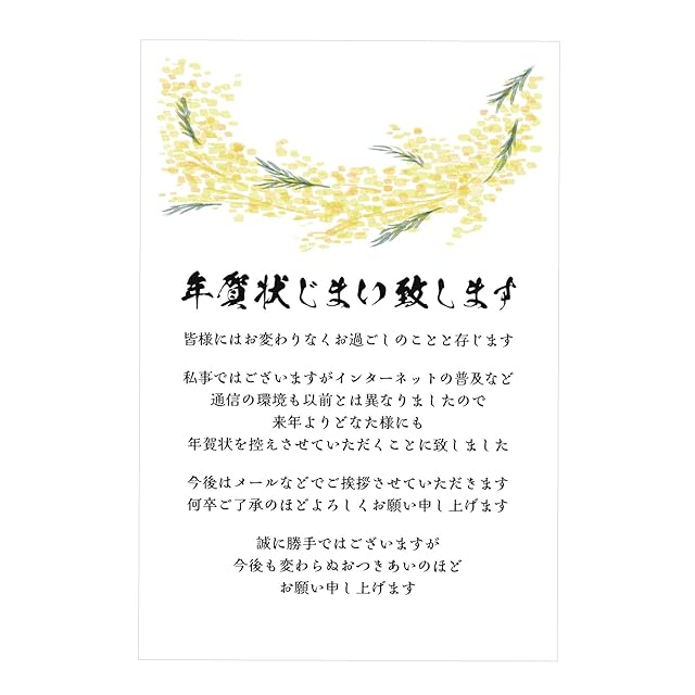 年賀状をやめたい方、年賀状じまいはがきで丁寧なご挨拶をして終わりにしましょう。疎遠で年賀状だけのお付き合い、連絡をとっていない、年末は仕事が忙しい、メールなどで連絡できている、年齢のこともあり終活で整理をしたい。ご連絡の挨拶文が印刷してある、文章印刷済みのはがき。(お名前の印刷はございません)切手を貼って投函いただく私製はがき用紙。(ご使用時に切手を貼ってご使用ください)通信環境の変化を理由に年賀状をやめて年賀状は辞めて、今後は年賀状とは別の形でお付き合いを続けていきたい、という内容の文章になります。