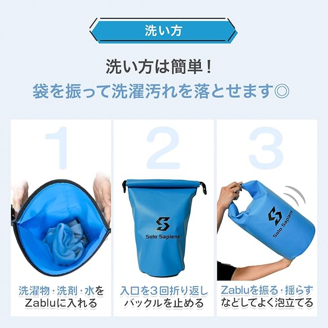 ソロサピエンスのザブル [Zablu] は、持ち運び式の洗濯バッグです。旅行先での洗濯に大活躍!折りたためて、軽量コンパクト。旅行、出張、アウトドア、部活、防災など様々なシーンで活用できます。