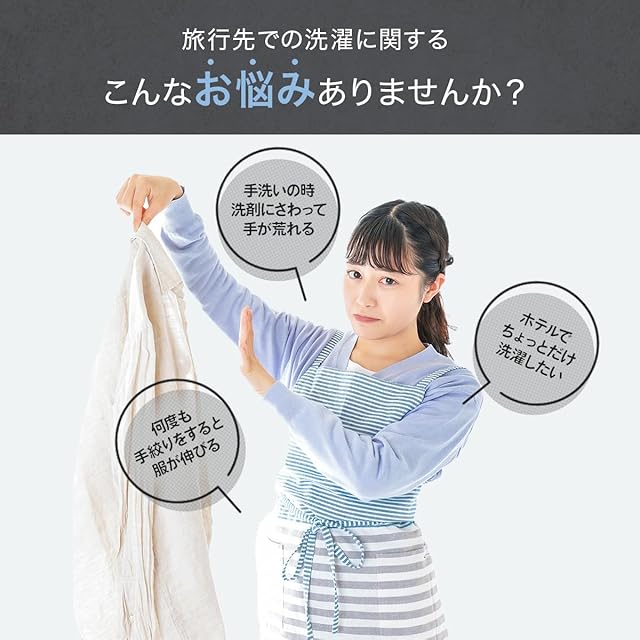 10Lサイズの洗濯バッグでは、一度にTシャツ3枚程度が洗えます。水を入れても5kgぐらいの重さで、女性でもしっかり袋を振って洗濯汚れを落とせます。洗剤に触らないで洗いと脱水ができるので、手が荒れにくい設計です。(洗剤自体は入れる必要があります)