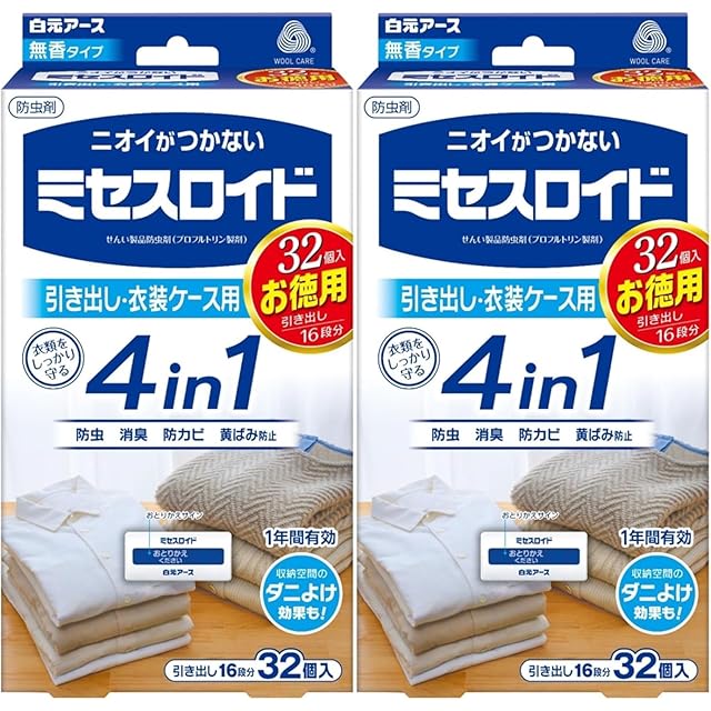 ミセスロイド 白元アース 衣類防虫剤 引き出し・衣装ケース用 64個 無香 無臭 1年間有効 収納空間のダニよけ効果付き 虫除け 防カビ 消臭 黄ばみ防止