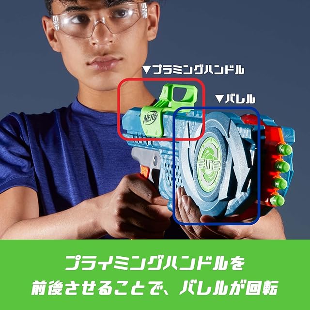 【バレル回転で対戦相手にサプライズ】ブラスター上部のフリップスライドを一番後ろに引いてから、一番前まで動かすと簡単にバレルを回転することができ、後方のバレルが前方に現れます。