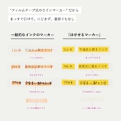 【特徴1】『はがせるマーカー』。はがせるから気軽にマークできる、きれいにはがせるフィルムテープを採用しており、マーカーペンでじかにラインを引きたくない本や参考書へも安心して使えます。