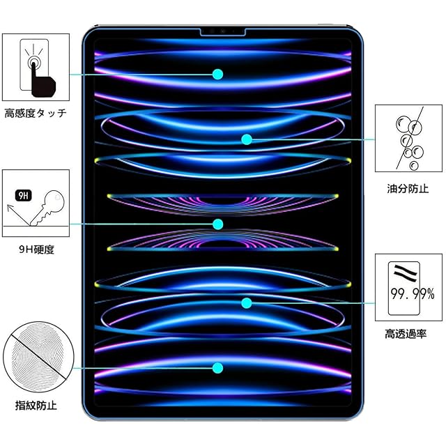 <br><br>【対応機種】iPad Pro 11 2022 New M2チップモデル / iPad Air 第5世代 2022 / iPad Air4 2020 第4世代 / iPad Pro 11 2021 第3世代 New M1チップモデル / 2020 第2世代 / 2018 第1世代 専用のデザインでスクリーンを保護します。<br><br>【9H高硬度】9H硬度を持つガラスにハードコーティングが施されることにより、外部からの衝撃をフィルムが吸収し、日常生活のよくある鍵傷、コイン傷、ブラグ傷、カッター傷などから保護。一体成型による高品質と高耐久度を実現しています。<br><br>【高感度タッチ】タッチ操作するときは支障なく、純正ガラスをこえるぐらい非常に滑らかで素晴らしい手触り心地です。<br><br>【 2.5Dラウンドエッジ加工】このフィルムはレザで精細に切られ、加工します。フィルムは装着後でも、ケースとは全然干渉しないです。角も2.5Dラウンドエッジできているため、滑らかな質感を与えてくれます。<br><br>【ウルトラクリア】超薄の0.3mmと99.9%高透過率で、何も貼っていないような感じで、iPad Retinaディスプレイをそのままお楽しみいただけます。<br><br>【気泡ゼロ】シリコーン吸着層に高品質な接着剤を使用し、気泡が入りにくく、位置合わせてから、フィルムの真ん中を軽く押すだけで気泡なし綺麗に吸着します。超初心者の方でも一発で綺麗に晴れます。<br><br>【防汚・指紋加工】高品質な防汚・指紋コーティングを施されるため、普通のフィルムより、指紋や汚れなどが付きにくいです。付いても簡単に拭き取れます。常に画面の美しさと綺麗さを保ちます。<br><br>【飛散防止】飛散防止コーティングを加工されてるため、フィルムは割った場合でも、破片は張り付いた状態で飛び散らず、ご自身をけがから守ってくれます。 <br><br>【iPad Air4/5 Pro 11 専用ガラス保護フィルム】取り扱い説明<br><br>◆空気が乾燥しており、静電気が発生するのが多く、お風呂場など無風、ホコリの少ない場所での貼り付けをお勧めです。<br><br>◆フィルムを貼り付ける前に、手を清潔にしてください。<br><br>◆フィルムを綺麗に貼るために、位置を合わせ前に液晶画面に汚れやホコリが付いていないことを再度ご確認ください。<br><br>① 濡れたティッシュペーパーや雑巾でスクリーンをきれいに拭き、埃の取り除きパッドで埃を除去する。<br><br>② 保護フィルムを開き、スクリーンの四つのコーナーに合わせ、殻の位置に合わせて軽く下ろす<br><br>③ 手でスクリーンの中心を押し、強化フィルムが自然にスクリーンに吸着する。<br><br>④ 清潔雑巾で余計の気泡を押し出し、操作完了。