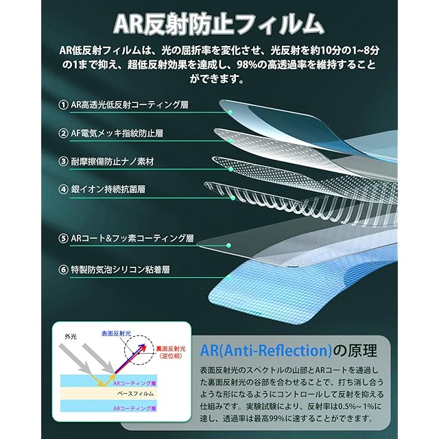 【超AR反射防止・高透過率】:セレナ 28系専用AR保護フィルムは、極微細なナノ分子からなるナノ材質を積層した東レナノ積層フィルムを用いて作製され、厚さは0.20mmに達することができます。同時にARコート技術を追加し、2層ARコーティング光学材質を内蔵し、光の屈折率を変え、光反射を約10分の1~8分の1まで抑え、超低反射効果を達成し、反射率は0.5%〜1%に達することができます。また、元の画面のハイビジョン効果を維持することができ、高透過率は98%~99%に達することができます
