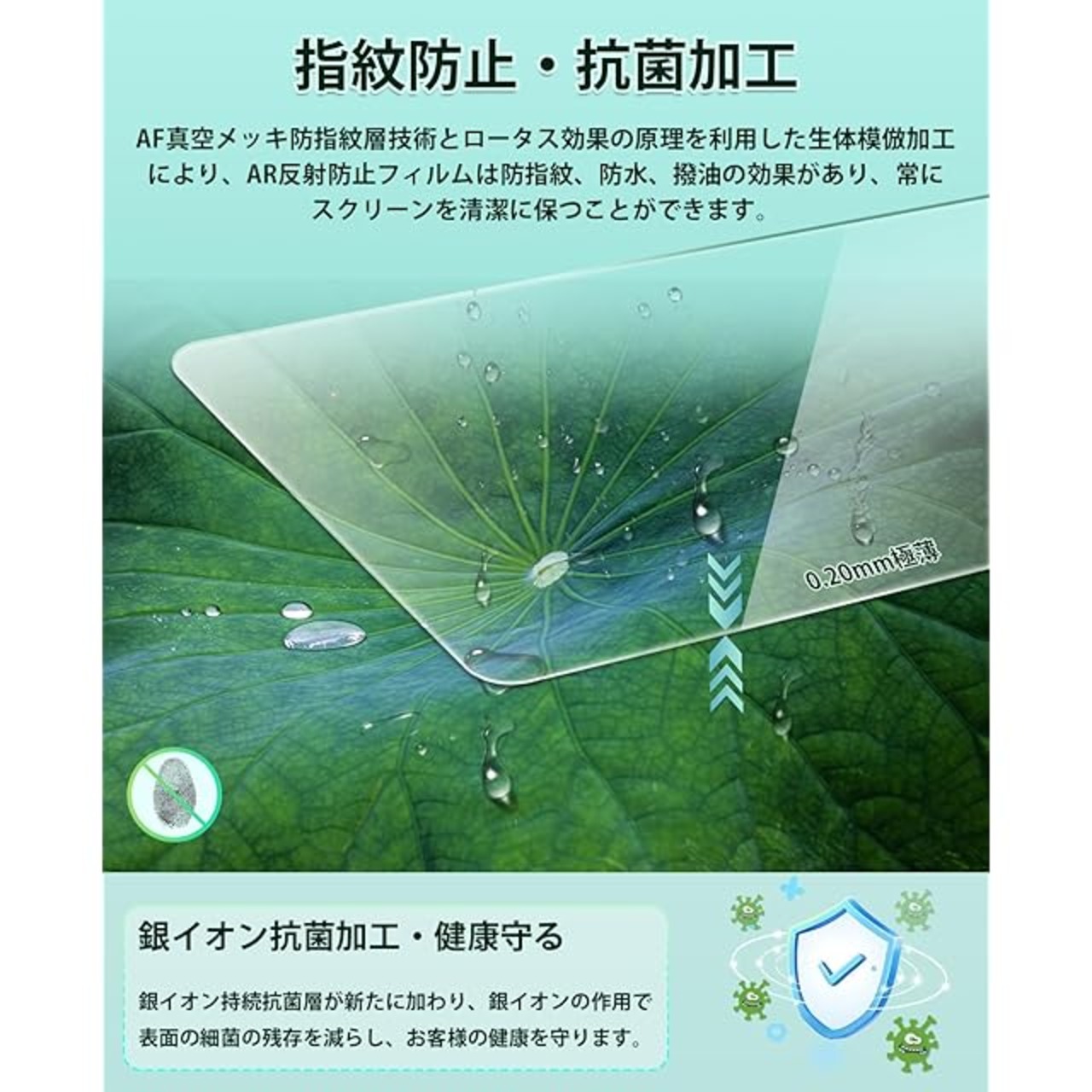 【AF真空メッキ指紋防止】:AF真空メッキ指紋防止技術及びロータス効果の原理を利用した生体模倣加工により、フィルムの表層に防指紋及び疎水撥油の効果を達成させ、画面を清潔で爽やかに保っています。銀イオン抗菌技術を新たに追加することで、細菌の残留を減らし、健康を保護することができます。同時に、フィルムエッジの2.5D曲面加工は、フィルム表面の張力を増加させ、衝撃を軽減し、手を傷つけないです