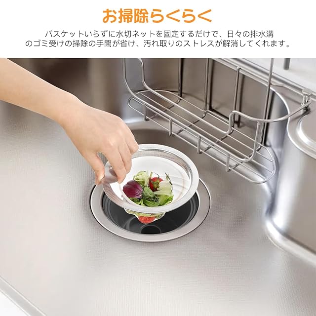 【掃除らくらく】キッチン排水溝ゴミ受けは、バスケットいらずに水切ネットを固定するだけで、日々の排水溝のゴミ受けの掃除の手間が省け、汚れ取りのストレスが解消してくれます。
