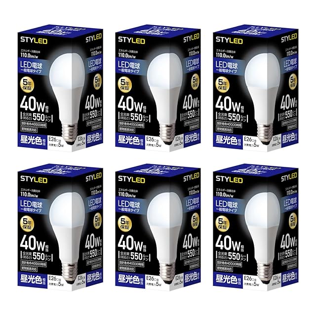 商品名:スタイルド LED電球 口金直径26mm 電球40W形相当 昼光色 5W 6個セット 一般電球・広配光タイプ 密閉器具対応 HA4T26D6