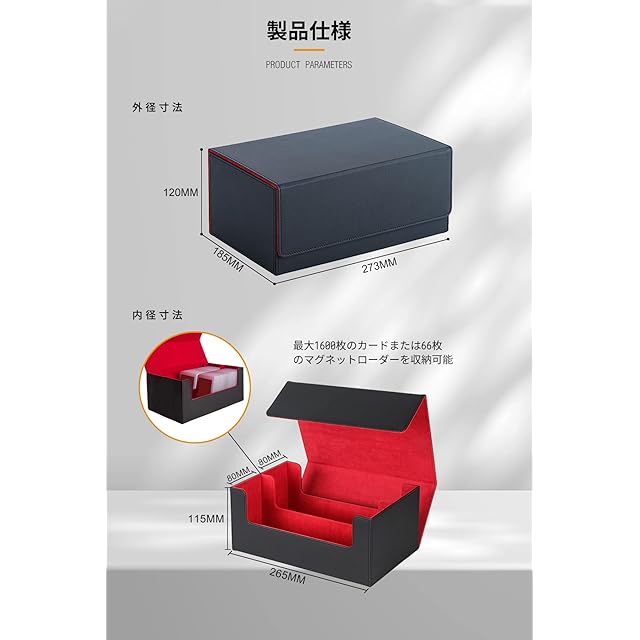 【製品仕様】デッキケース【外部サイズ】縦27.3cm 幅18.5cm 高さ12cm 【内部寸法】縦26.5 cm 幅8+8cm 高さ11.5 cm【材質】上質PUレザー 【重量】660g 【収納枚数】最大1600枚のカードまたは66枚のマグネットローダーを収納可能、市販されているほぼ全てのカードゲームに対応。 ・スタンダードサイズ63×88mm ・スモールサイズ59×86mm ・など様々なカードゲームに対応しております。