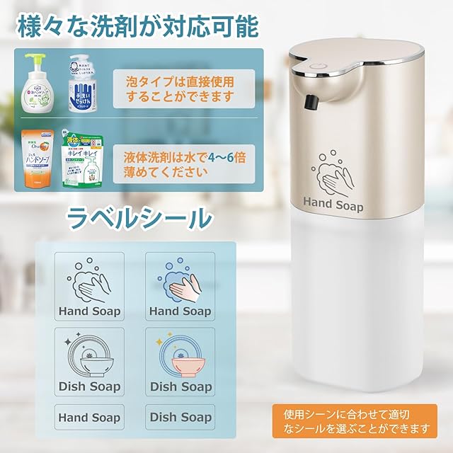 商品名:Cheftick ソープディスペンサー ハンドソープ 自動 泡 吐出量4段階調 400ml 壁掛け オートディスペンサー 食器洗剤 ディスペンサー 充電式 キッチン 洗面所などに適用 半透明ボトル 日本語説明書付き (シャンパンゴールド, 泡タイプ)