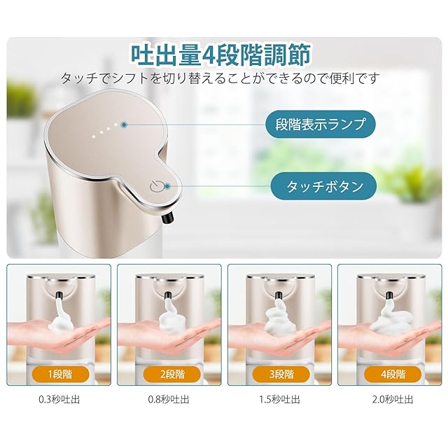 「四段階調節」4段階調節機能があり、自分に合った吐出量を選ぶことができる。スイッチを入れてタッチボタンに軽く触れ、ランプの数に応じて何段目かを確認します。各シフトの吐出量は0.3g、0.8g、1.5g、2.0gです。大人でも子供でも自分に合った吐出量を選ぶことができます。