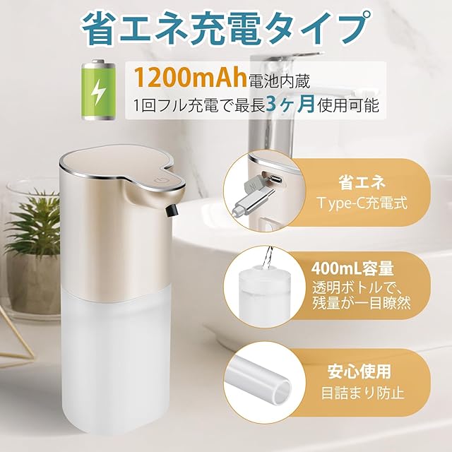 「400ml大容量」ソープディスペンサーには400 mlの大容量ボトルがあり、これ以上頻繁にハンドソープ液を入れる必要はありません。透明なボトルのデザインなので、洗剤の残量がひと目でわかります。