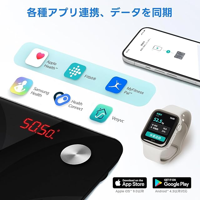 アプリの特徴:自動転送、データグラフ化、運動と食事のアドバイス、計画を設定、ベビーモード、16種類言語対応