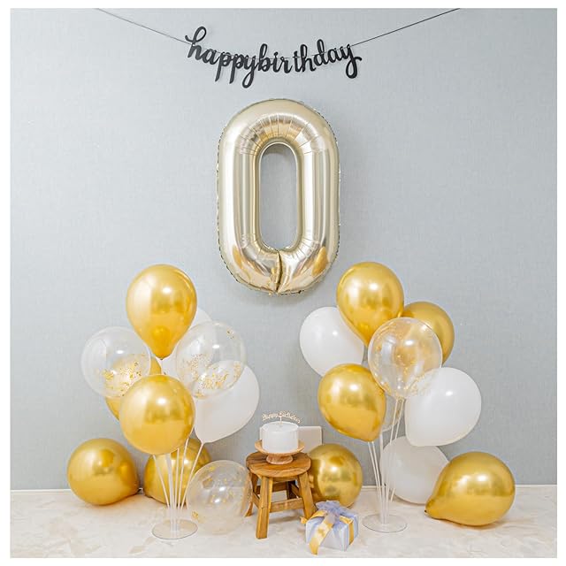 【内容】数字アルミバルーン0歳用 (90cm)、"happy birthday"ガーランド 、ホワイト5枚・シャンパンゴールド5枚・ゴールドコンフェッティラテックスバルーン10枚 合計20枚、ストロー・リボン付き ※スタンド、ケーキ等の小物はセットに含まれておりません。