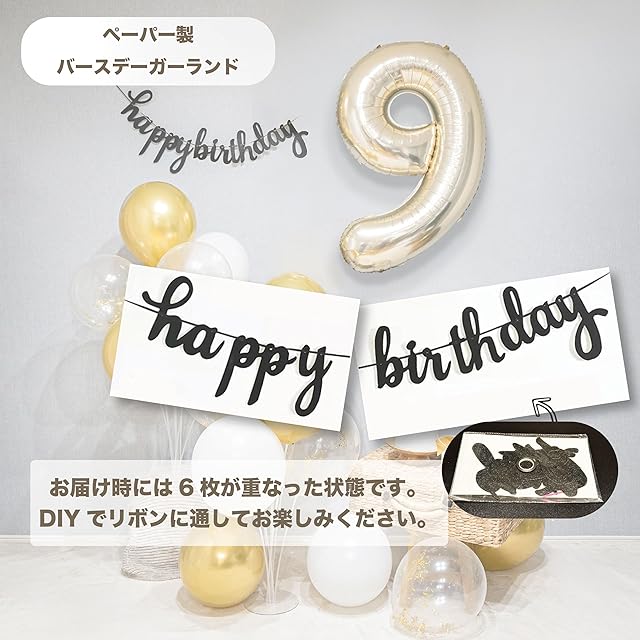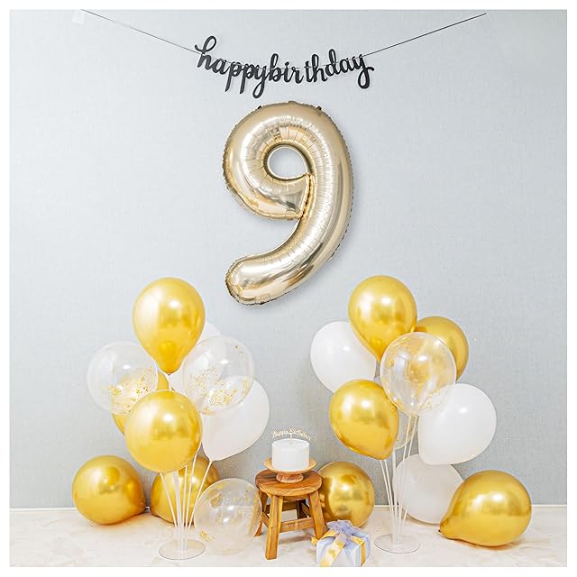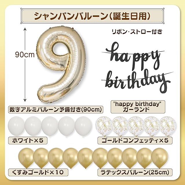 【内容】数字アルミバルーン9歳用 (90cm)、"happy birthday"ガーランド 、ホワイトラテックスバルーン5枚・くすみゴールドラテックスバルーン10枚・ゴールドコンフェッティラテックスバルーン5枚 合計20枚、ストロー・リボン、予備ナンバーバルーン付き ※スタンド、ケーキ、トランク等の小物はセットに含まれておりません。