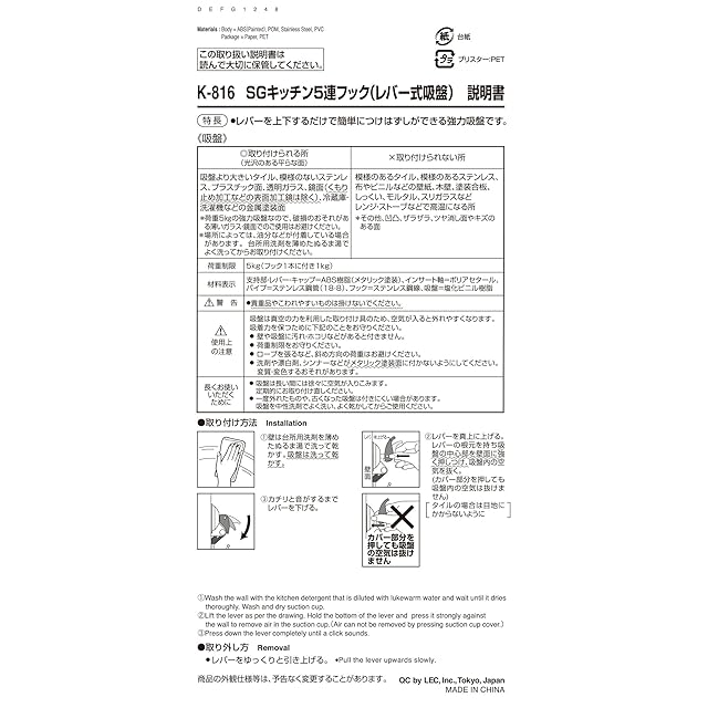 レック SG キッチン 5連フック レバー式 吸盤