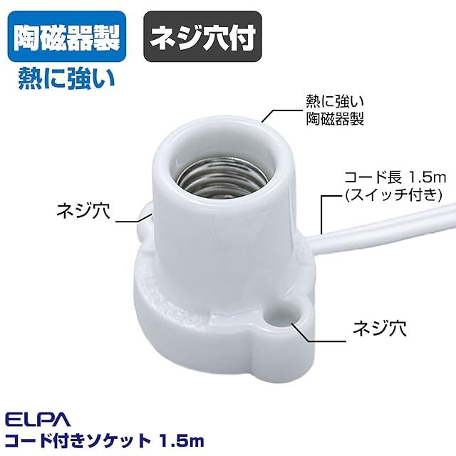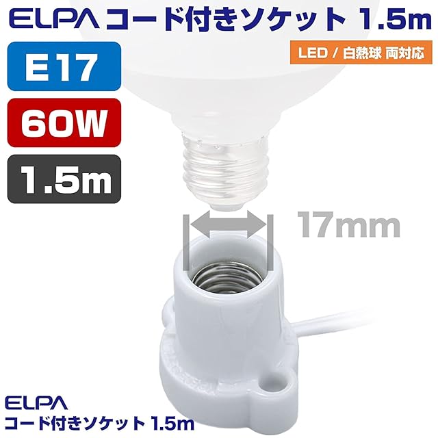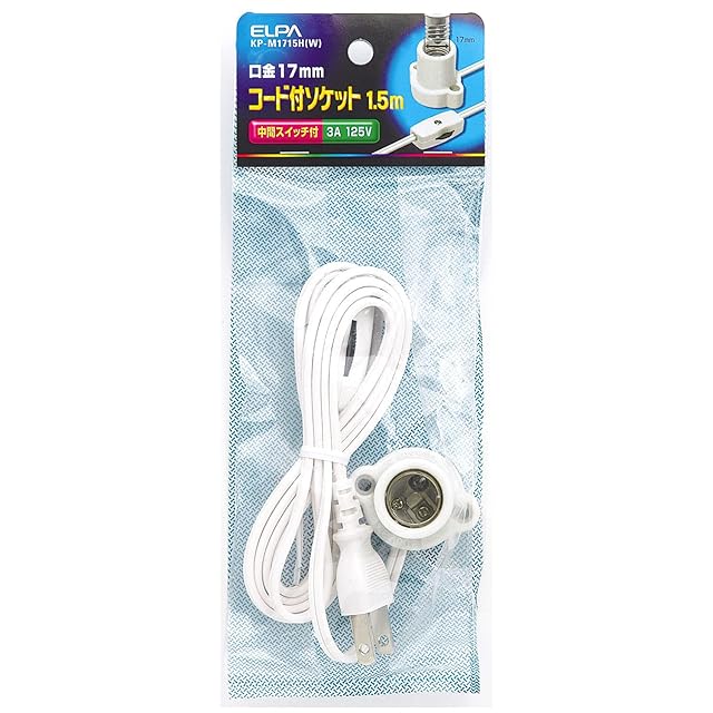 商品名:エルパ (ELPA) コード付ソケット (口金 E17 / 1.5m / ホワイト) 中間スイッチ付 KP-M1715H(W)