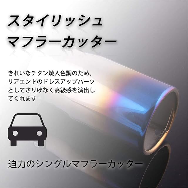 【美しいリアビューを演出】- きれいなチタン焼入色調のため、リアエンドのドレスアップパーツとして高級感を演出してくれます。迫力のあるシングルタイプのマフラーカッターです。