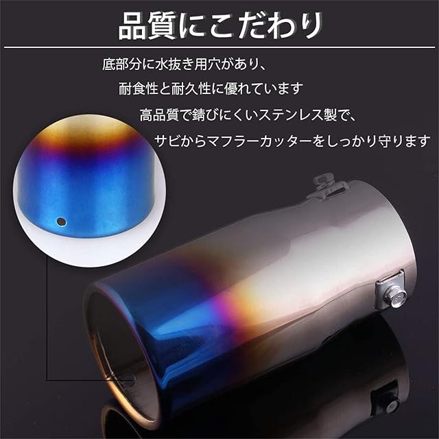 【錆びにくい】- ステンレスで作られて、錆びにくくて耐久性、耐食性に優れています。水抜き用穴があり、サビからマフラーカッターをしっかり守ります。