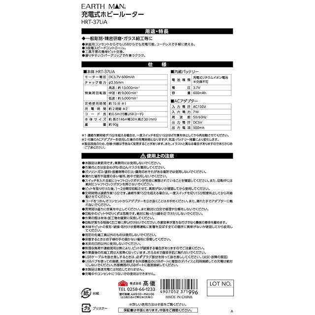 商品名:高儀 EARTH MAN 3.7V 充電式ホビールーター HRT-37LiA