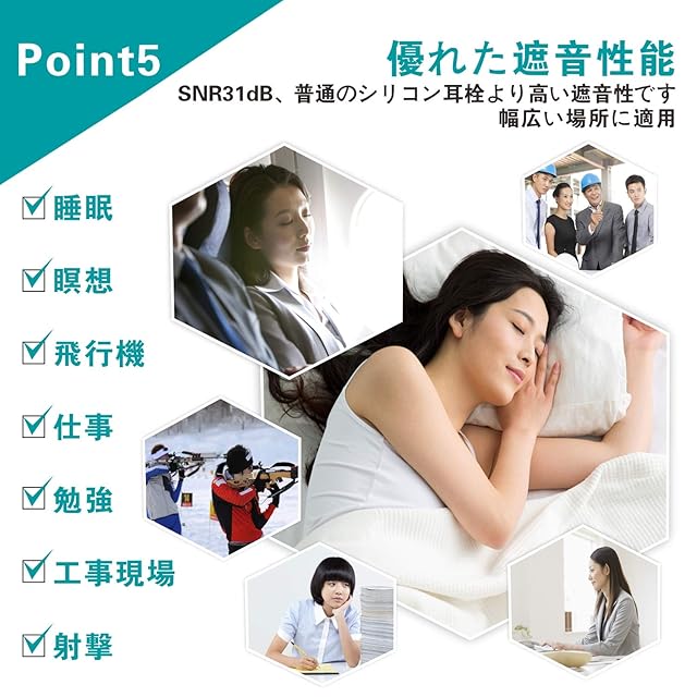 【幅広い適用場所】SNR31dB、優れた遮音性能で、幅広い場所に適用。ご家庭、滞在先のホテル、キャンプ場、飛行機等での睡眠時、仕事、勉強、瞑想 な集中したい時の使用に非常に適しています。列車や長距離スな長距離移動の際にも重宝します。ライブコンサート、パーティー、クラブ、スポーツイベント、花火大会、射撃、工事現場などうるさい環境での不快感がある時にもご使用ください。