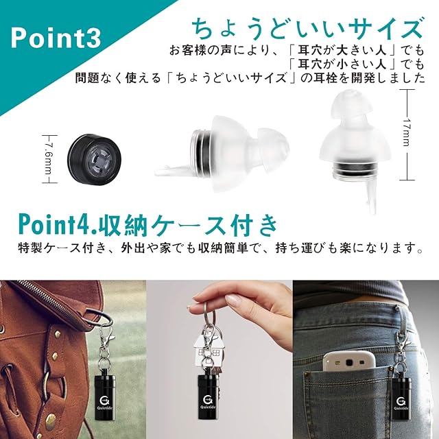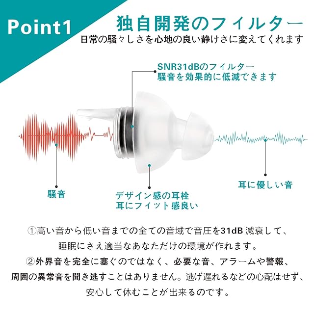 【耳につけるコツ】 はめ方は、はめる耳と反対側の手で耳を引っ張って穴を広げ、少しねじるように軽く押し込みます。 「フィルターを正しい位置に装着する」「落ちない程度に軽く押し込む」イメージがコツかな。 ウレタンの耳栓のように力任せにギュウギュウ押し込むと、プラグのシリコンの部分で耳を塞ぐようになってしまい、音がくぐもります。そうなったら押し込みすぎです。 正しい位置にあれば、耳栓があるのを忘れるくらいに自然に聞こえます。 【ご注意】外部音を完全に塞ぐのではなく、音圧を31dB 低減します。必要な音、アラームや警報、周囲の異常音を聞き逃すことはありません。災害時、逃げ遅れるなどの心配はせず、安心して休むことが出来るのです。