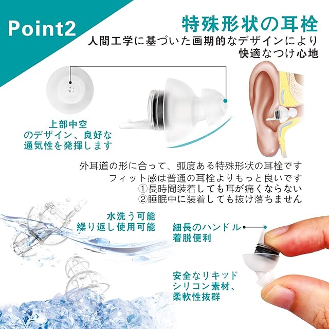 【最新設計の特殊形状耳栓 快適なつけ心地】人間工学に基づいた画期的なデザイン、弧度がある特殊形状の耳栓で、外耳道の形に合って、耳にフィット感よく、睡眠中に装着しても抜け落ちません。環境保護、無毒性のリキッドシリコーン素材を採用し、柔軟性抜群です。長時間装着しても耳が痛くなりません。