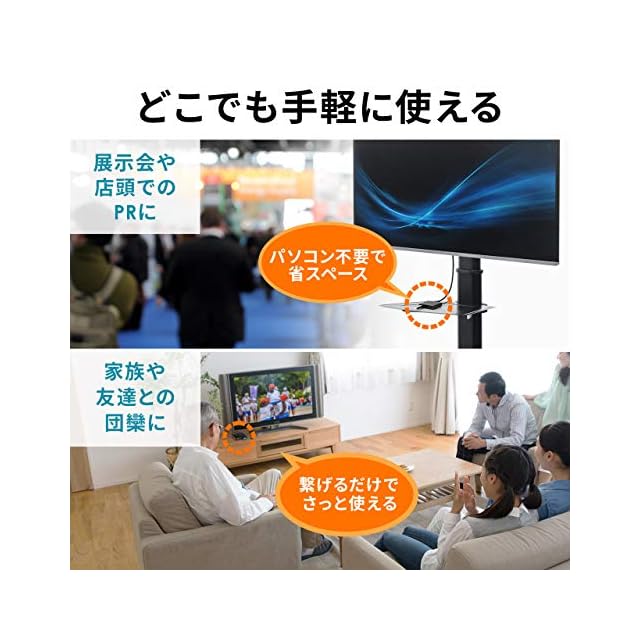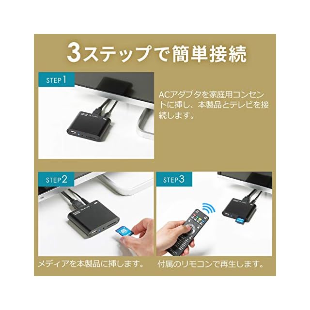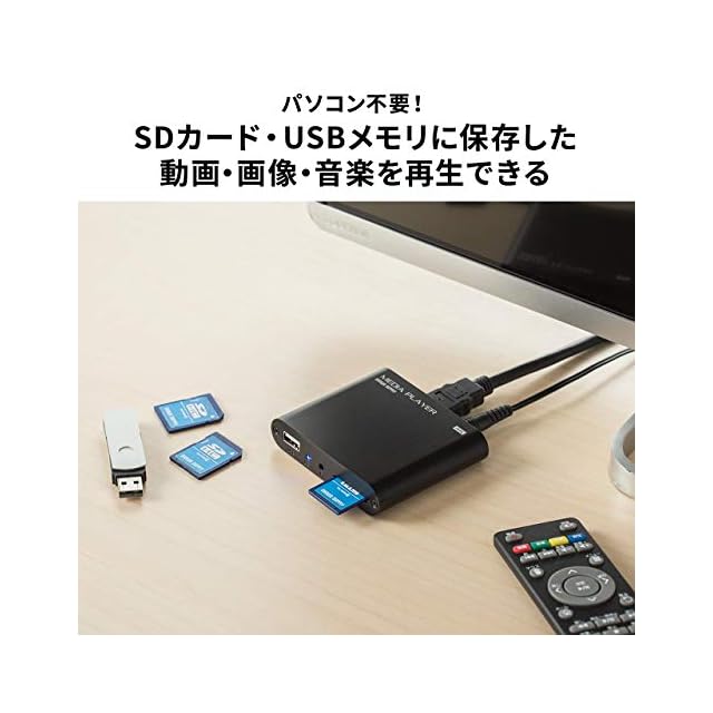 USBメモリ/SDカードに保存した動画・画像・音楽をテレビやプロジェクターで再生ができるメディアプレーヤーです。再生したいデータをUSBメモリまたはSDカードに保存し、本製品に接続することでパソコンを使うことなく再生できます。