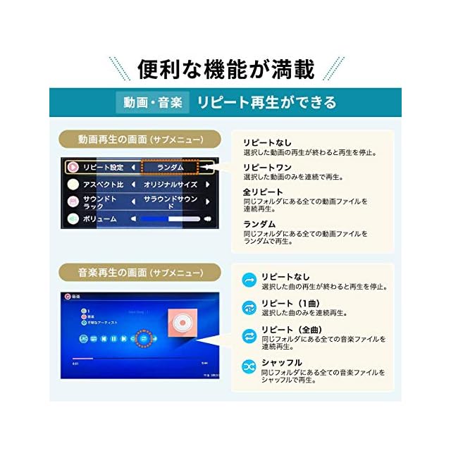 画像のスライドショー再生にも対応しています。また、動画ファイルの再生時に、メニューボタンを押すことでリピート設定などの詳細設定が可能です。