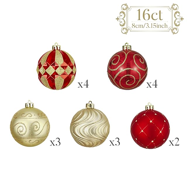 Valery Madelyn 北欧風 クリスマス ボール オーナメント 豪華 8cm 16個 セット ボールクリスマス ツリー 飾り 飾り付け おしゃれ ゴージャス レッド ゴールド 赤金