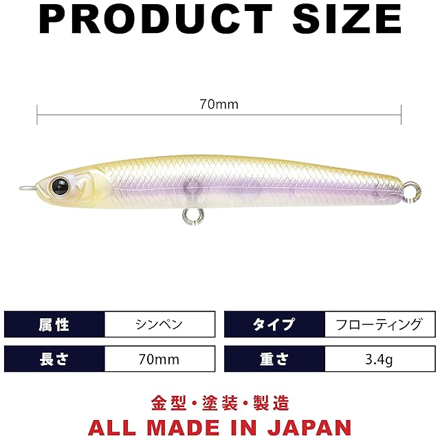 ■ 対応魚種とサイズ展開の豊富さ ワンダーは45mmから95mmまでのサイズ展開を揃え、対象魚やベイトサイズに応じた柔軟な選択が可能です。 メバル、カサゴなどのライトゲームから、 シーバス、ヒラメ、マゴチといった定番ターゲット、 さらには青物まで—— 多魚種・多フィールド対応のバーサタイル性も、大きな魅力です。