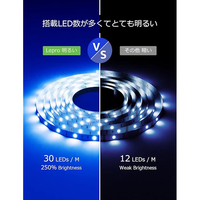 『適格請求書の発行対象商品』【LEDの数が多くてより明るいです!】ほかのメーカーはただ60個LEDが搭載され、暗くて耐久性が弱いです。Leproのledテープライトは、5mのLEDテープ基板に高演色5050SMDチップを150個ぐらい使っており、明るく、鮮やかな色再現が可能な高耐久LEDテープです。