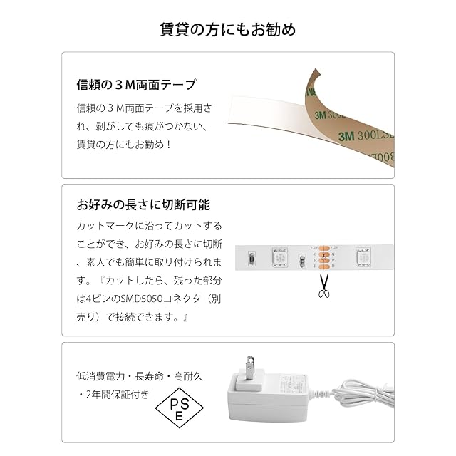 【簡単設置&切断可能】付属の強力な3M両面粘着テープライトは、直線はもちろん、曲線的なコーブ照明やコーニス照明にも最適です。LEDテープを剥がしても痕がつかない、賃貸の方にもお勧め!お好みの長さに切断、取り付けも簡単です。『ご注意:切断すると残った部分はコネクター(別売り)がないと再利用できないことを予めご了承下さい』