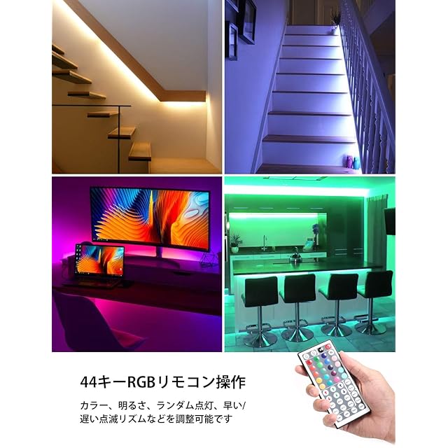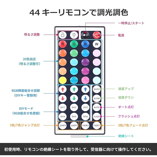 【カラー照明として人気上昇中!】RGBテープライトは通常のレッド、グリーン、ブルー、ホワイト含めて他色20種類のほか、6種類のカーラーDIYモードを備え自在に調整が可能です。専用の44キーコントローラーで、それぞれのカラーLEDの明るさを制御することができます。※ご注意:W(ホワイト)は若干青みがかった色で蛍光灯の昼光色以上に青いです。