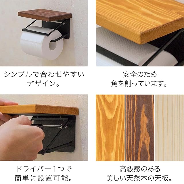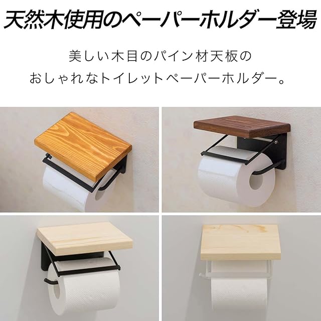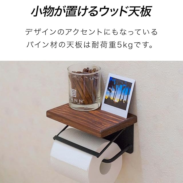 <b>トイレがオシャレ空間に早変わり!</b><br> <b>天然木使用のペーパーホルダー登場</b><br> 美しい木目のパイン材天板とヴィンテージ感溢れるスチールフレームの<br> 組み合わせがとってもおしゃれなトイレットペーパーホルダーです。<br> <br> <b>アレンジが楽しめる</b><br> <b>小物が置けるウッド天板</b><br> デザインのアクセントにもなっているパイン材の天板は耐荷重5kgです。<br> トイレットペーパーのストックの他、小物を置いてアレンジも楽しめます。<br> <br> <b>賃貸でも安心</b><br> <b>新たに穴を開けずに設置可能</b><br> 元々付いているペーパーホルダーを外して同じ位置に取り付けが可能です。<br> 新たにネジ穴を開ける必要がないので賃貸でも安心です。<br> ※ネジ・アンカー等は付属しません。<br>