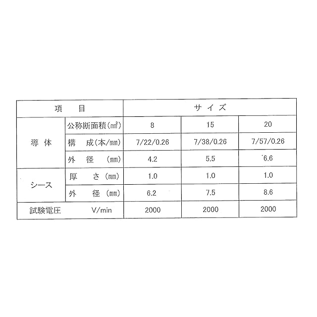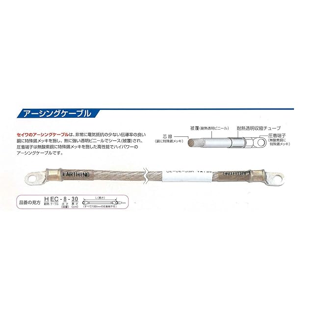 安心・安全な日本製になります。<br>電線の太さは、3種類ご用意しております。<br><br>8sq 許容電流:66A【用途:ヘッドライト、オーディオ】<br>15sq 許容電流:92A【用途:エンジン周辺】<br>20sq 許容電流:121A【用途:エンジン周辺】<br><br>セイワのアーシングケーブルは、非常に電気抵抗の少ない伝導率の良い<br>銅に特殊鍚メッキを施し、熱に強い透明ビニールでシース(被覆)され、<br>圧着端子は 無酸素銅に特殊鍚メッキを施した高性能でハイパワーの<br>アーシングケーブルです。