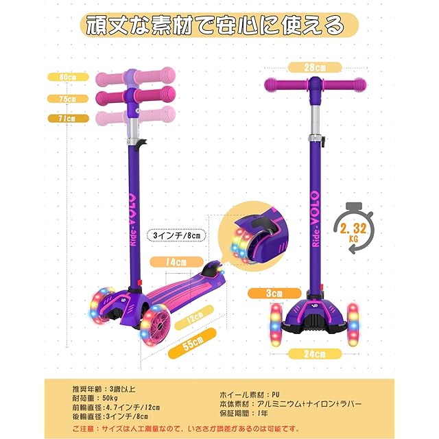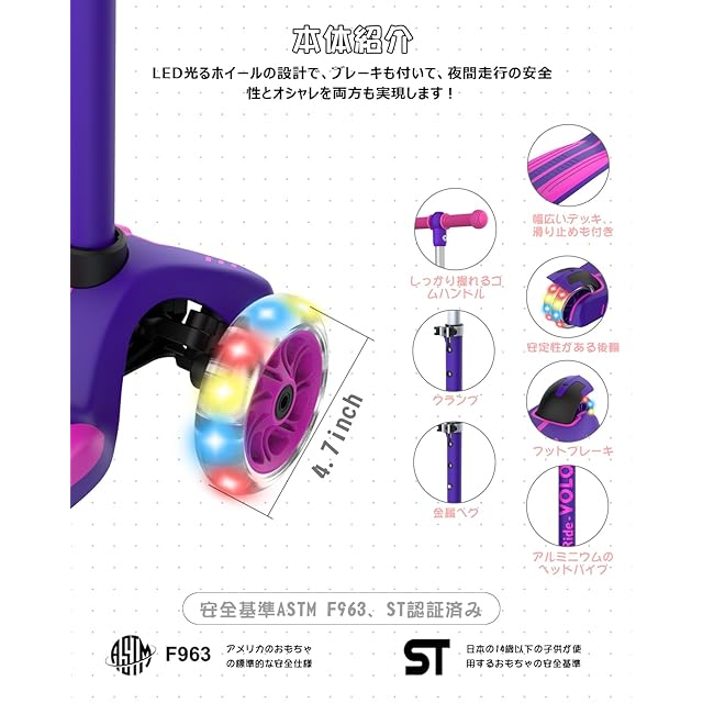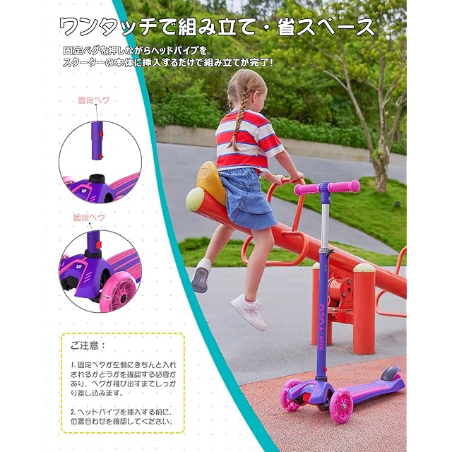 商品名:RideVOLO キックスクーター 子供向けキックボード キックスケーター 女の子 三輪車 三段階高さ調整 光るLEDタイヤ 耐荷重50kg アウトドアに適用 おもちゃ 安定 パープル