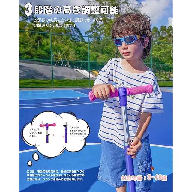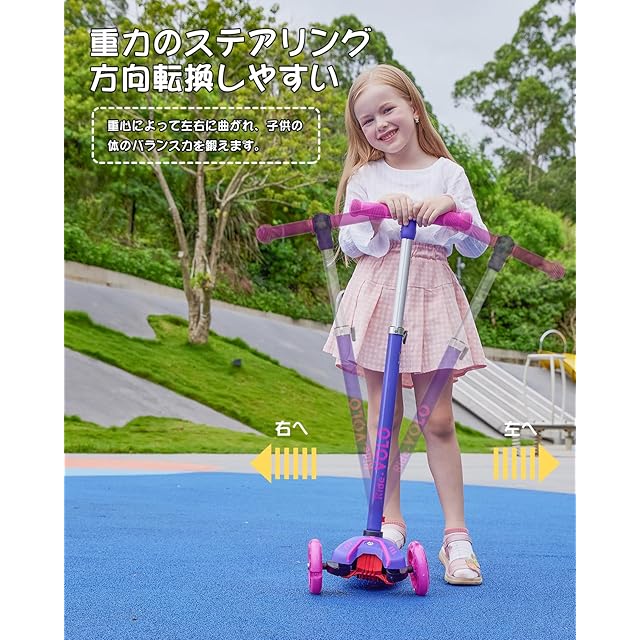 【3段階高さ・方向転換しやすい】本製品は子供用キックボードで、高さは71cm、75cm、80cmの3段階に調節可能です。約3歳から10歳(身長により異なる)の子供に対応し、成長に合わせて快適な高さに調整できます。重力ステアリング採用しており、重心を変えるだけでスクーターを左右に曲がれ、スムーズに方向転換できます。体を傾けることで方向をコントロールし、さらに、子供の体のバランス力を鍛えることにも役立ちます。