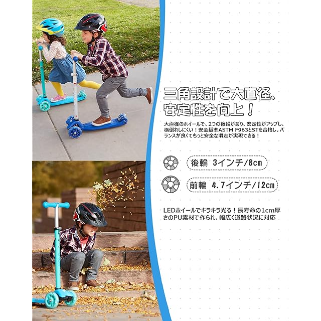【2つの後輪・三角設計・安全に滑走!】この子供用キックスクーターは三角安定デザインを採用し、転倒を防止して、安定性を強化し、通常のキックボードよりも優れた安定感を提供します。置き場にも困らず、穏やかにスクーターを使用できます。子供へのプレゼントにも最適です。前輪の直径は12cm/4.7インチで、後輪は8cm/3インチです。しかも、2つの後輪により、滑走中の安定性が向上し、より高い安全性を持ちます。