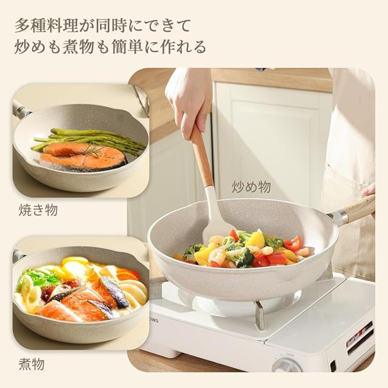 【快適な調理体験】内面がマーブルコートをしているため、焦げ付きにくくスムーズに調理できます。調理後もスポンジで軽く拭くだけで、汚れもスルッと落ちます;