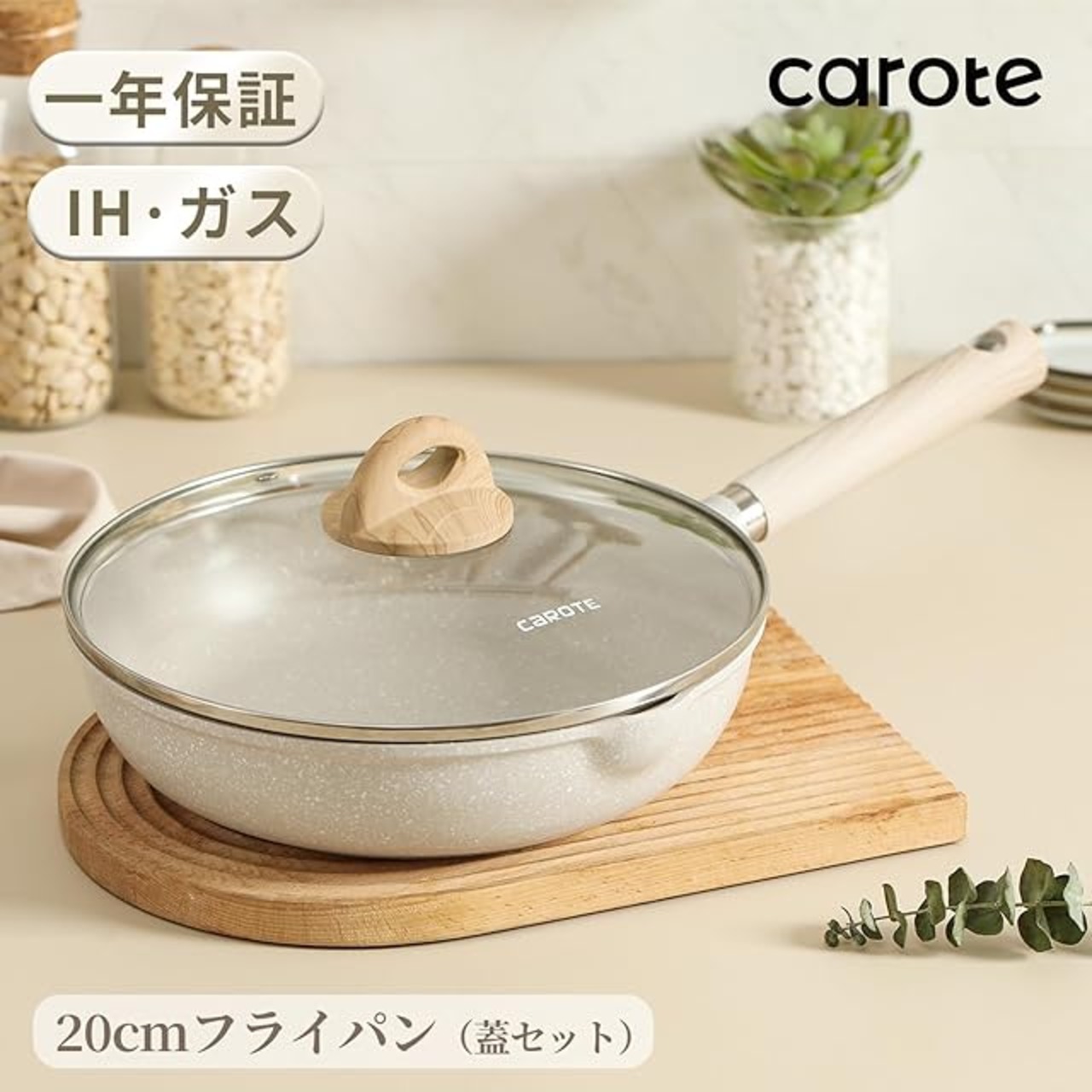 CAROTE カローテ フライパン 蓋付き 20cm ih対応 PFOA PFOS フリー マーブルコート ツルツルすべる くっつきにくい 洗いやすい 目玉焼き オムレツ オール熱源対応 一年 グレージュ Cosyシリーズ