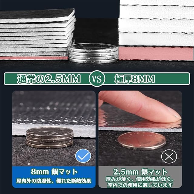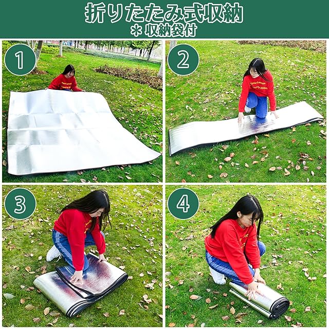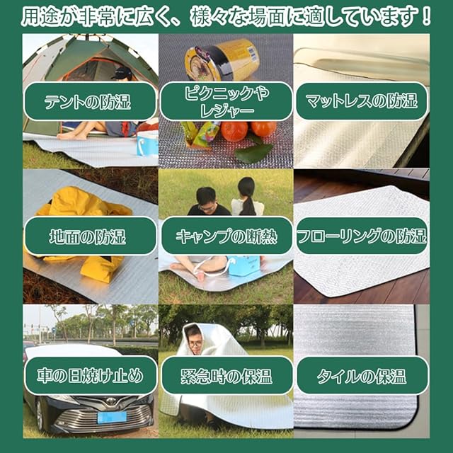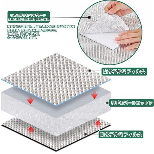 【アップグレード版素材】厚さ約8mm双面アルミニウム膜防潮マットは、両面アルミ膜の中の良質なパールコットンを採用しています。高品質のアルミホイルですので、防水防湿で、優れた断熱性と摩擦耐えの性能があり、引っ張っても割れない。